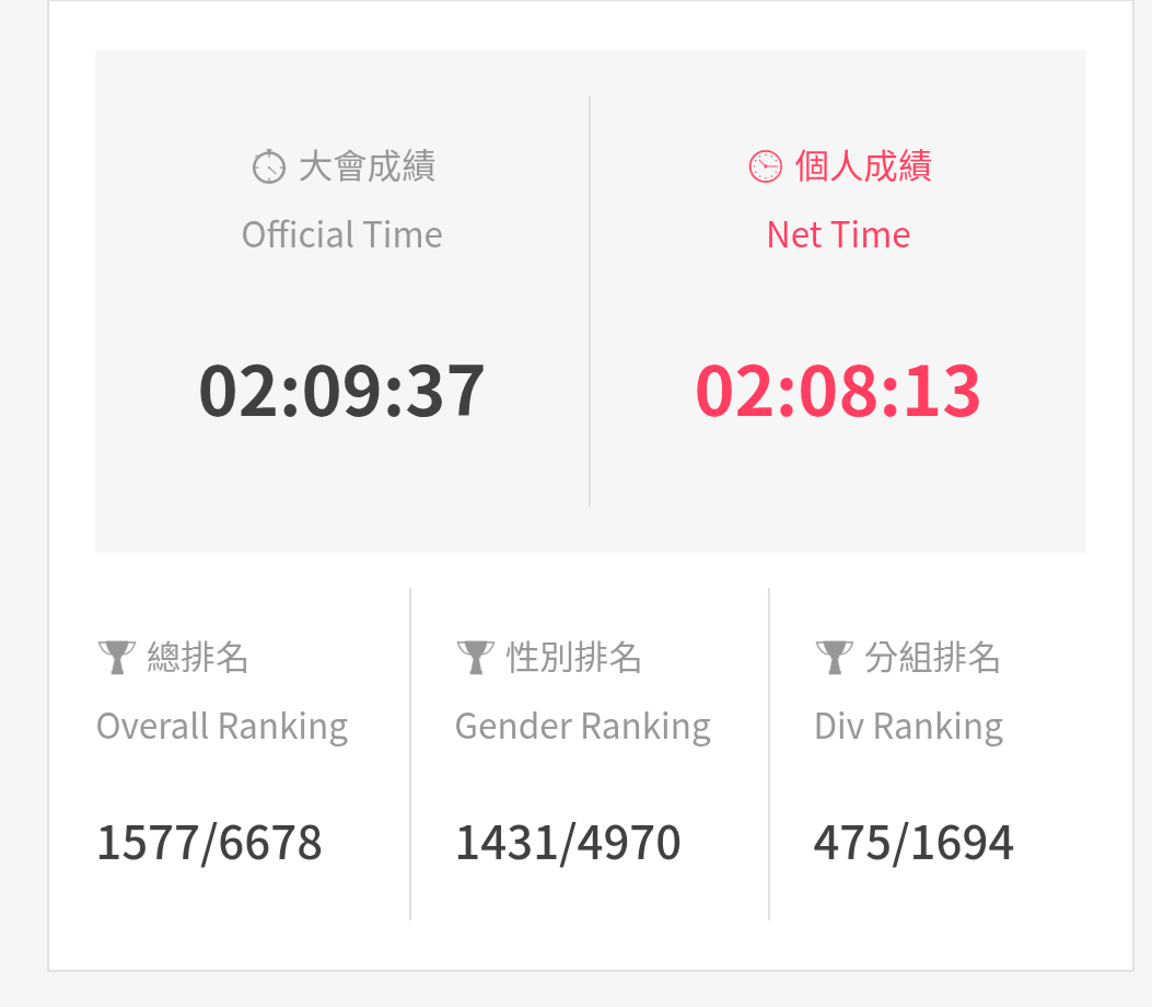 若以我手錶計算的實際半馬距離,成績大概是2:05:09,不過這次實際距離比半馬長一些些。所以成績為2:08:13。不過沒差,兩者都有破我的PB了,看來壓榨策略應該是可行的,但就要想想抽筋問題要如何處理了。(比完賽後也是到處抽筋,有夠痛苦XD)